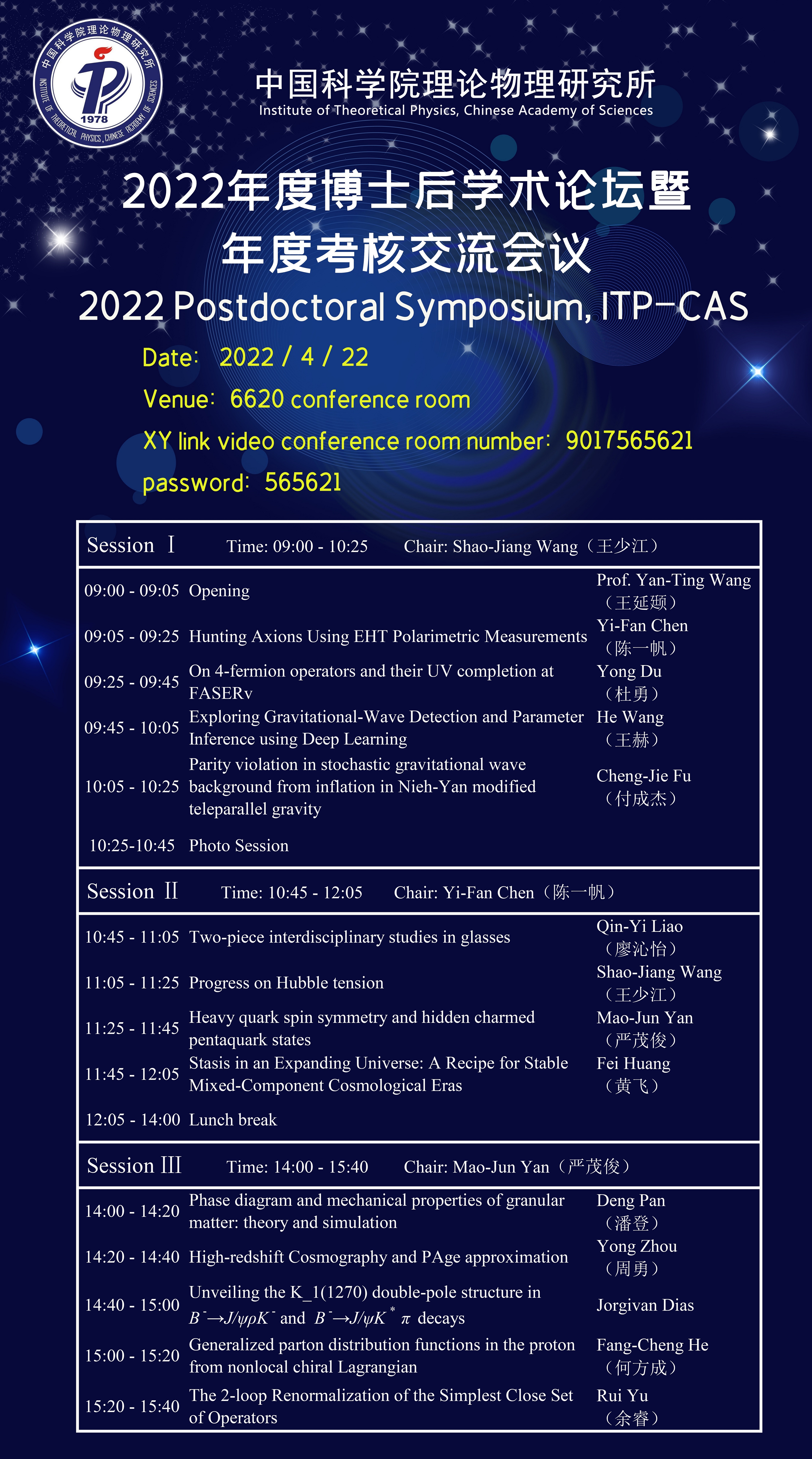 4月22日,理论物理所2022年度博士后学术论坛暨博士后年度总结交流会议成功举行。此次论坛采用现场与视频会议相结合的形式,博士后、合作导师及部分研究生共计40余人参加。所长蔡荣根研究员以视频方式参会,副所长王延颋研究员出席论坛并致辞。