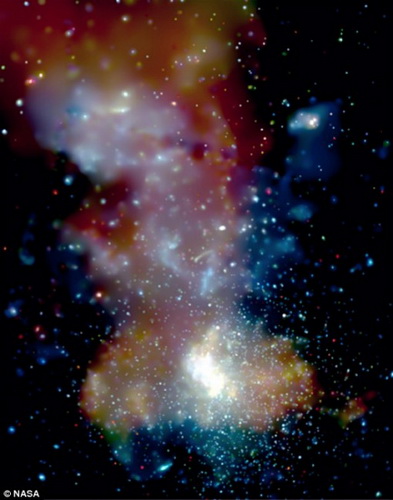 钱德拉望远镜非常强大,因为它能穿透银河系中心发出的阻碍可见光传播的气体和尘埃物质,观测银河深处。这张图是由低能X射线(红色)、能量居中的X射线(绿色)和高能X射线(蓝色)合成的。