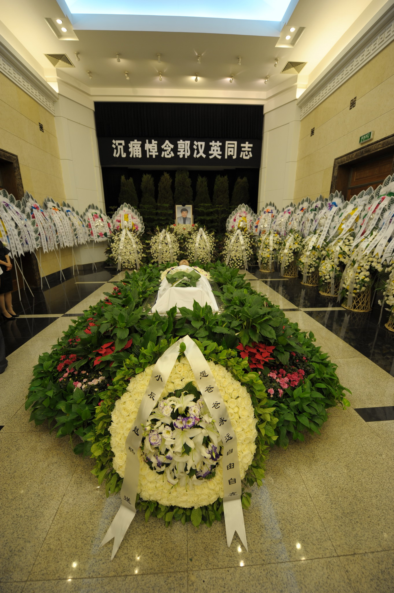 6月11日上午,八宝山殡仪馆东礼堂庄严肃穆,东礼堂门庭上方悬挂着“送别郭汉英”横幅,礼堂正厅上方悬挂着“沉痛悼念郭汉英同志”横幅,郭汉英生前爱听的小提琴音乐在礼堂回荡,郭汉英遗体安放在鲜花丛中。