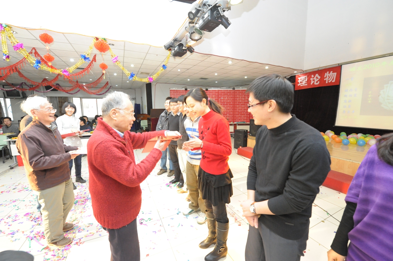 借此联欢会的机会,还举办了研究生优秀学业奖表彰仪式及我所第三届乒乓球比赛颁奖仪式,到场的何祚庥院士、戴元本院士、郝柏林院士、吴岳良院士、孙昌璞院士及牟克雄书记、陈晓松副所长分别为获奖者颁了奖。