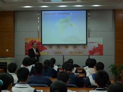 Luca教授通过运用实例、动画、故事和现场演示等多种方法,多层次,多角度地为同学们讲解了什么是混沌和湍流现象。他告诉同学们,混沌和湍流的问题不仅仅是科学家们十分关注的研究课题,它在我们的生活中也无处不在。混沌和湍流理论在天气预测、灾害控制等多个领域都有很重要的应用。报告中Luca教授用简单生动的语言,深入浅出的为同学们解释了“混沌体系”与“复杂体系”之间的区别,让同学们认识到初始条件对于混沌系统的演化的重要性。在历时一个小时的报告中,同学们被Luca教授风趣幽默的演讲方式所吸引,在Luca教授的引导下,对混沌系统有了一个初步的了解,对身边的一些混沌和湍流现象也有了更深刻的认识。很多同学还在报告过程中与Luca教授进行互动,提出自己的想法,与Luca教授进行了详细的交流。
