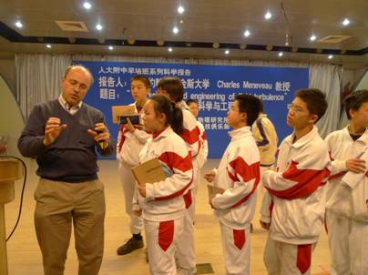 2012年4月1日,在中国科学院卡弗里理论物理研究所、理论物理国家重点实验室、北京青少年科技俱乐部和人民大学附属中学的共同努力下,第二场“中国科学院卡弗里理论物理研究所/理论物理国家重点实验室拓展项目”专题报告会在人大附中成功举行。报告邀请到美国霍普金斯大学Charles Meneveau教授,他为该校早培班300余名师生带来题为“流体湍流中的科学与工程学”的精彩报告。