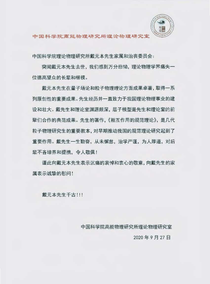 中国科学院高能物理研究所理论物理研究室唁电