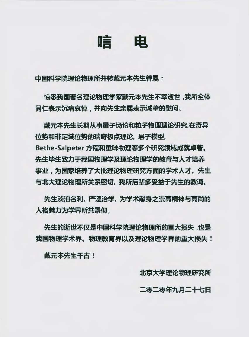北京大学理论物理研究所唁电